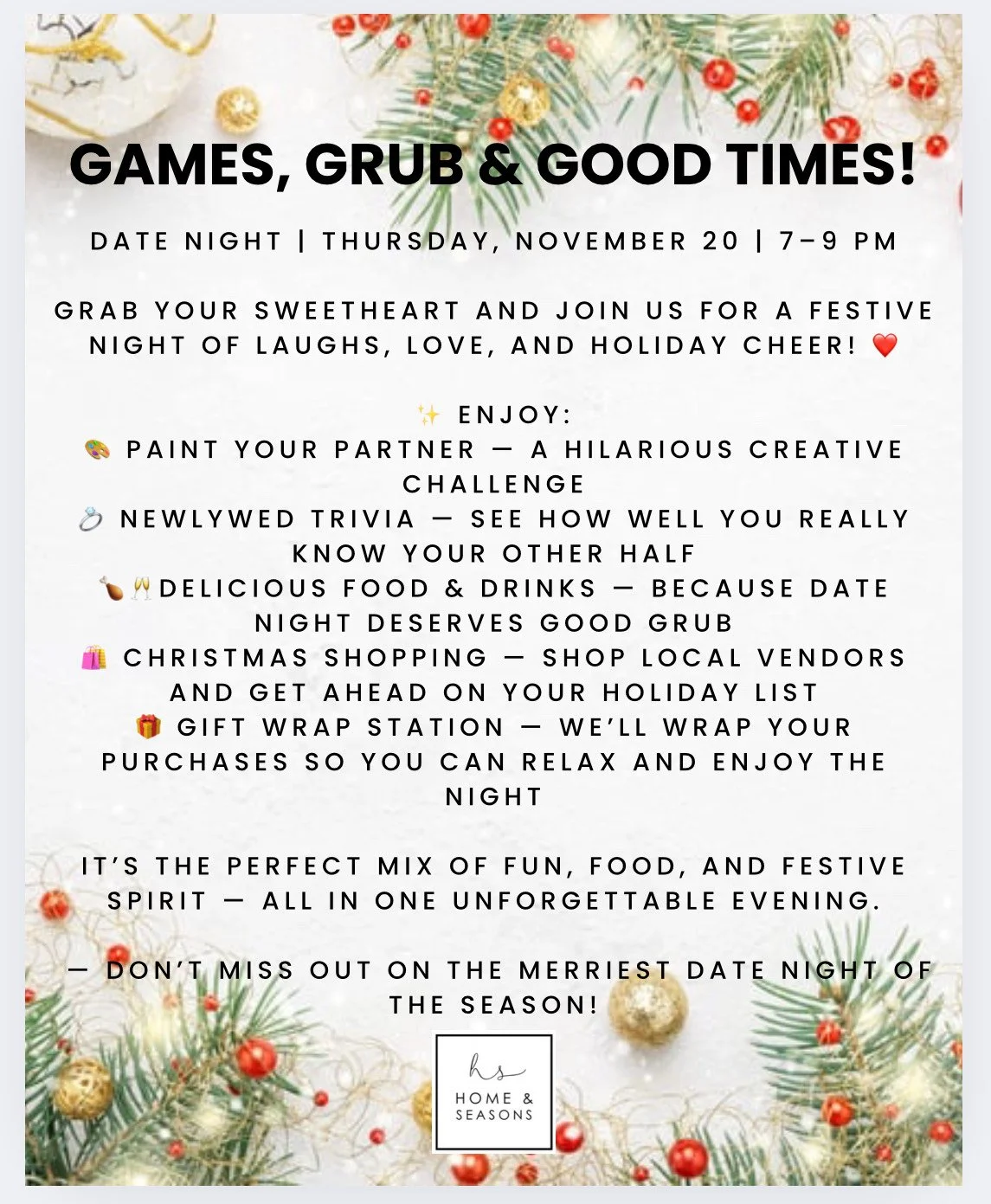 Join Home & Seasons GA on Thursday, November 20th from 7–9 PM for a lively evening of laughter, bites, and bonding! It’s DATE NIGHT at Home & Seasons GA! Expect a night filled with fun games, delicious snacks, and local shopping vibes. It’s the perfect excuse to unwind, connect, and treat yourself to some good times.