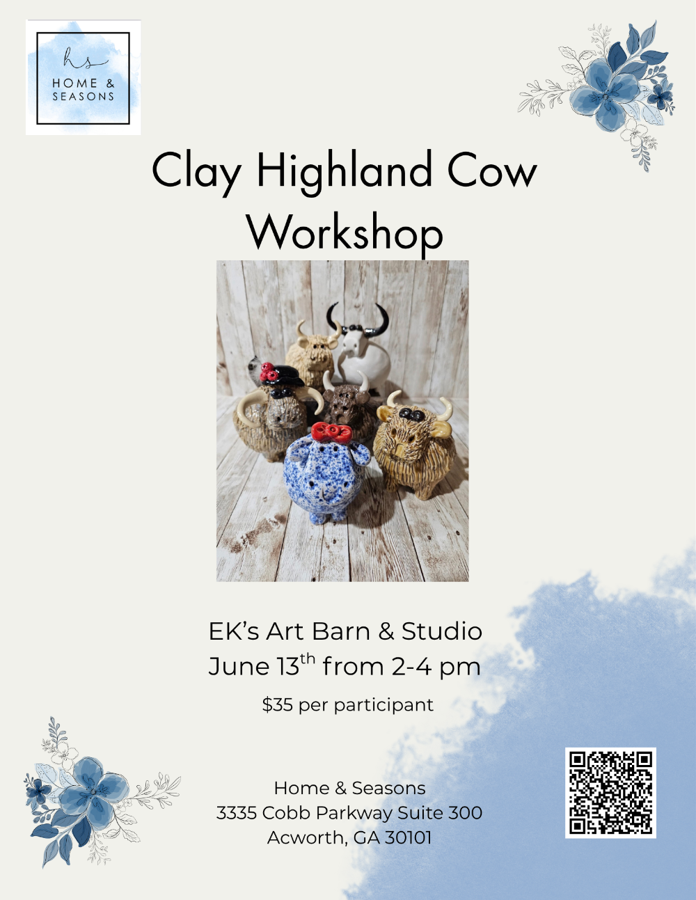 Join us for another amazing hands-on workshop with EK's Art Barn & Studio! You can make your own highland cow out of clay! Their instructors are amazing and will walk you through the steps, beginner friendly! $35 per participant. Click on this link to register: https://homeandseasons.ricoconsign.com/store/product/Classes/0F400Q You will receive your project in 3-4 week after the class, as it needs to be fired and glazed. All Sales Final.