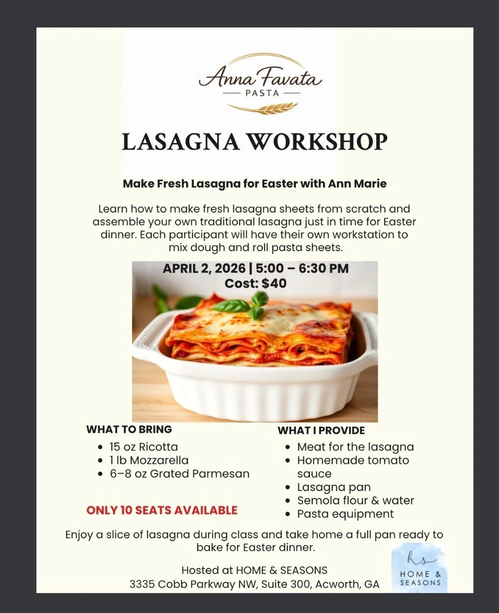 Enjoy a slice of lasagna during class and take home a full pan ready to bake for Easter dinner.
